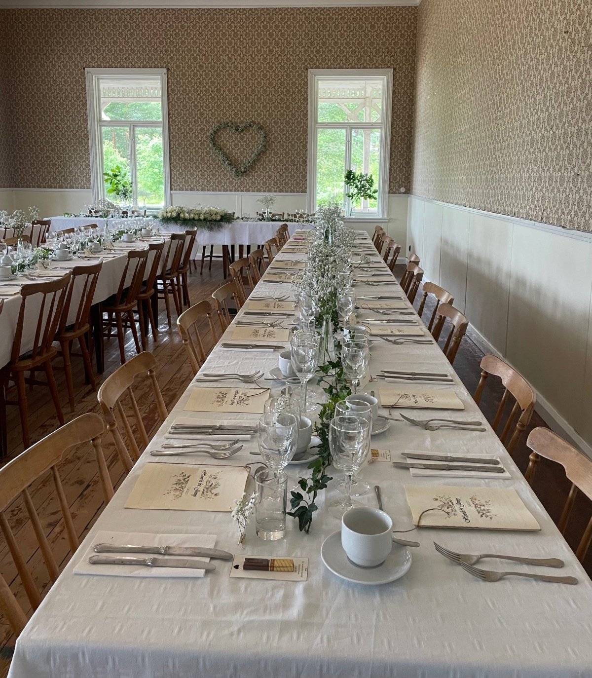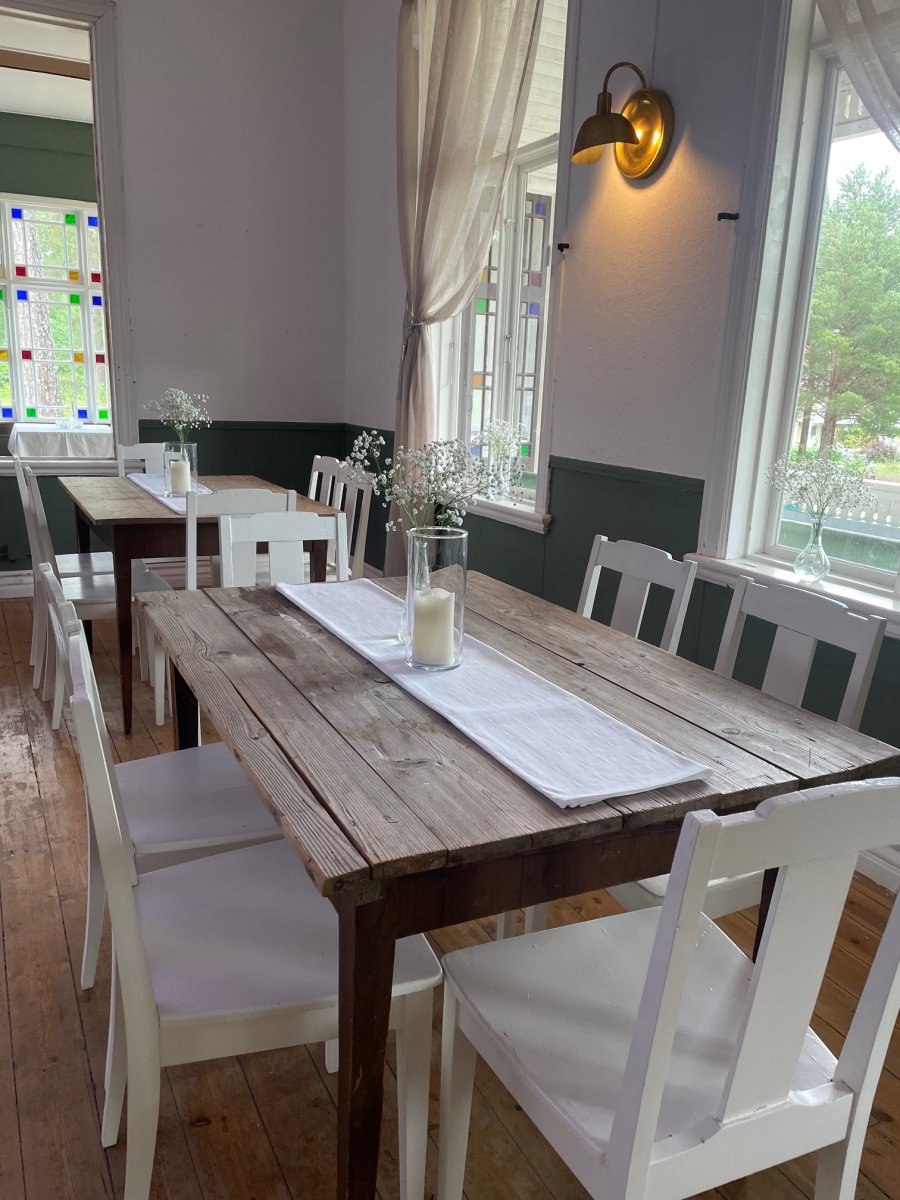 I huvudbyggnaden "stora hotellet" finns två stycken salar, båda med utsikt över trädgården och sjön. I den ena ryms ca 60 personer och i den andra ca 150 personer. Vid en bröllopsfest möblerar vi och dukar till middag i den sal som passar ert sällskap och efter era önskemål, i den andra salen dukar vi fram brudskål och snittar och kanske även tårtan - om inte vädret tillåter för att avnjuta dessa ute på verandan eller i trädgården.